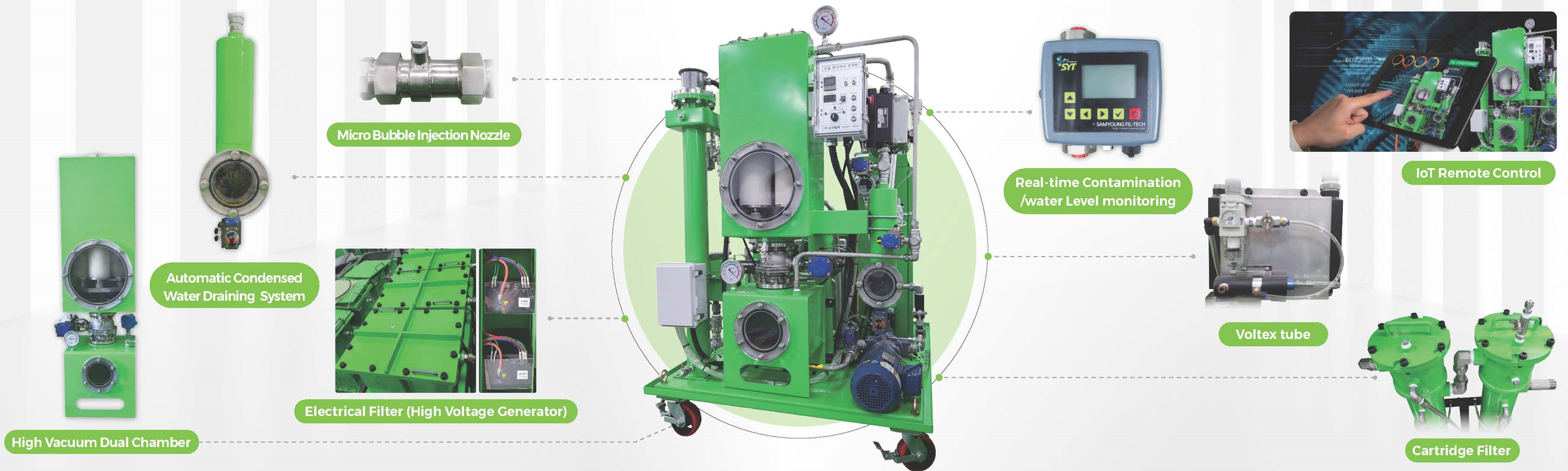 Samyoung’s Oil Conditioner is designed to remove moisture / sub-micro size particles/ varnish from oil and reduces total acid rate using innovative Technologies (1) High Vacuum Dual Chamber and (2) Electro-Static Filter. The newly developed ‘Micro Bubble Technology’ shortens the time taken for Pipe Flushing with drastic improved result against to conventional pipe flushing method. Samyoung commits to continue the development of innovative technology and delivers high standard products with the best service to our clients.